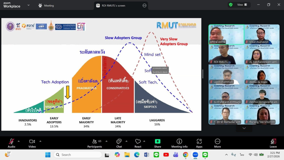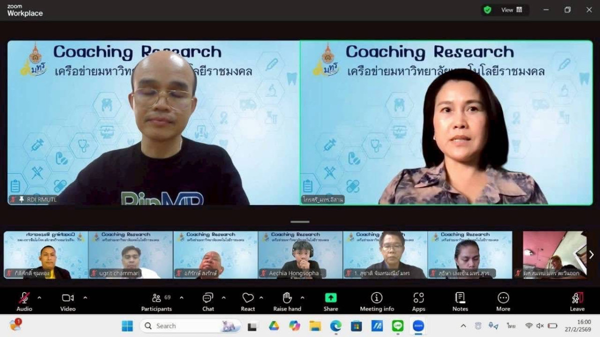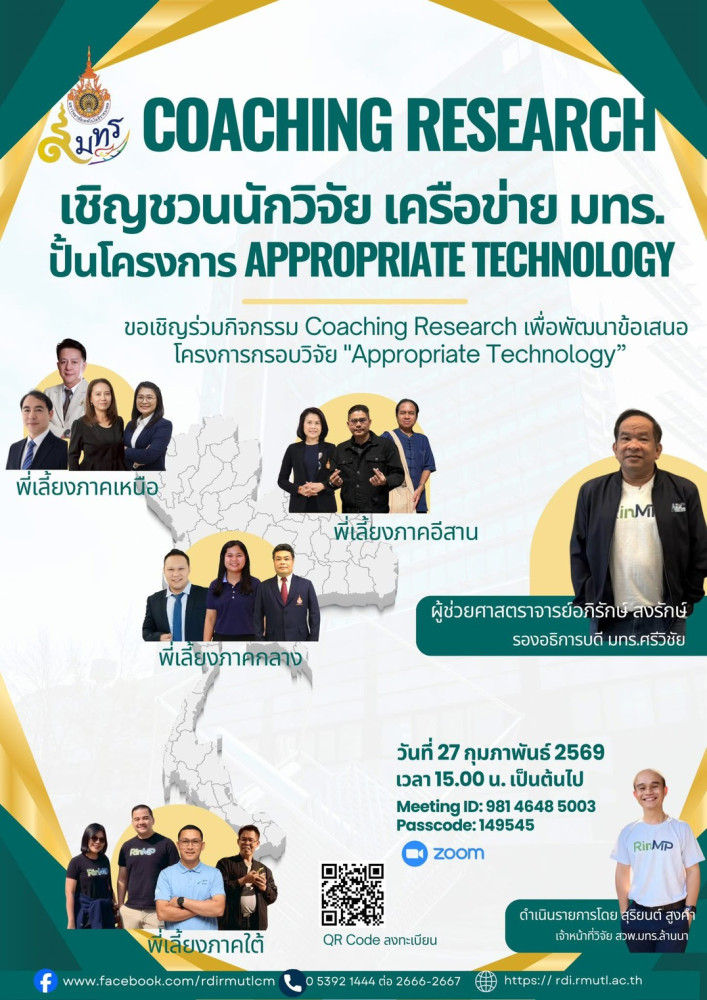 วันศุกร์ที่ 27 กุมภาพันธ์ 2569 เวลา 15.00 น. เป็นต้นไป สถาบันวิจัยและพัฒนา ร่วมกับเครือข่ายมหาวิทยาลัยเทคโนโลยีราชมงคล จัดกิจกรรม Coaching Research ปั้นโครงการ Appropriate Technology ผ่านระบบ Zoom...