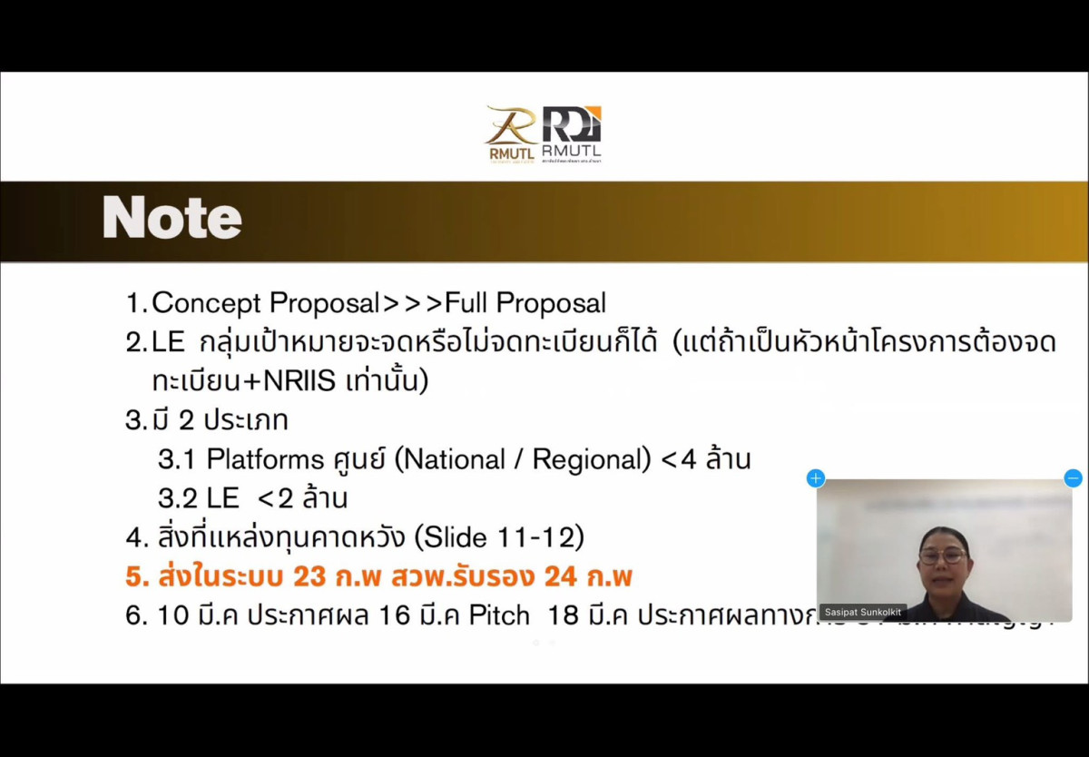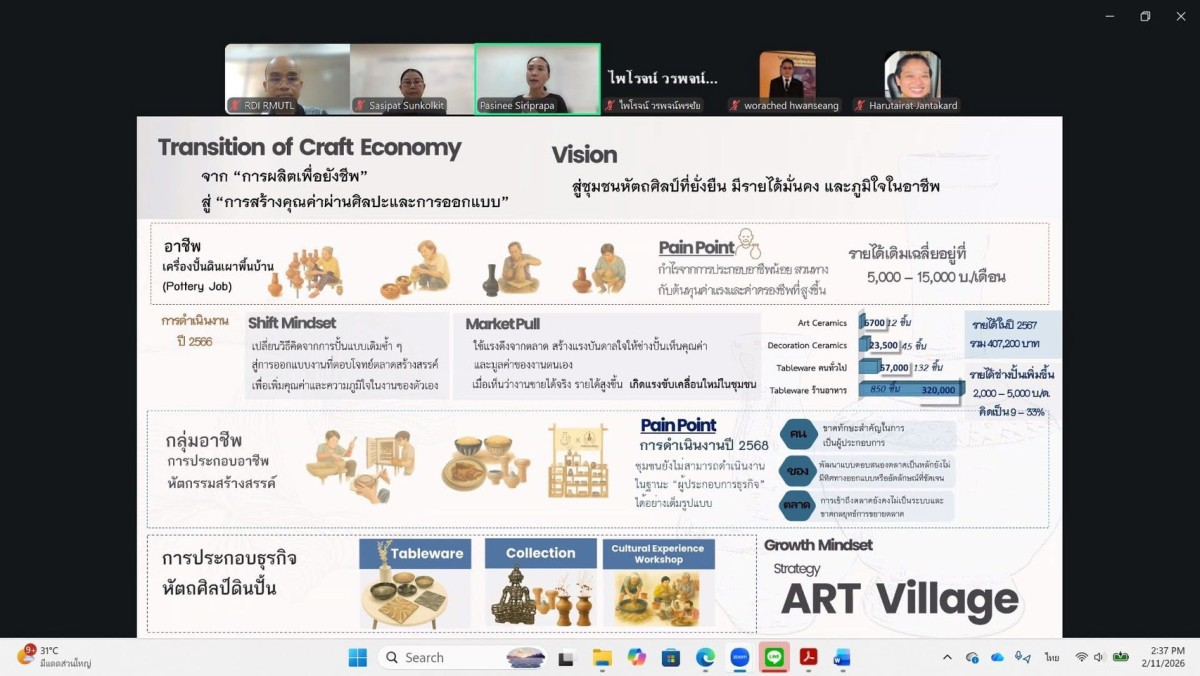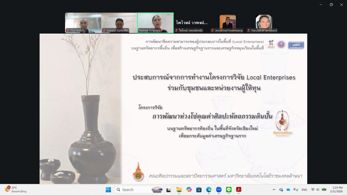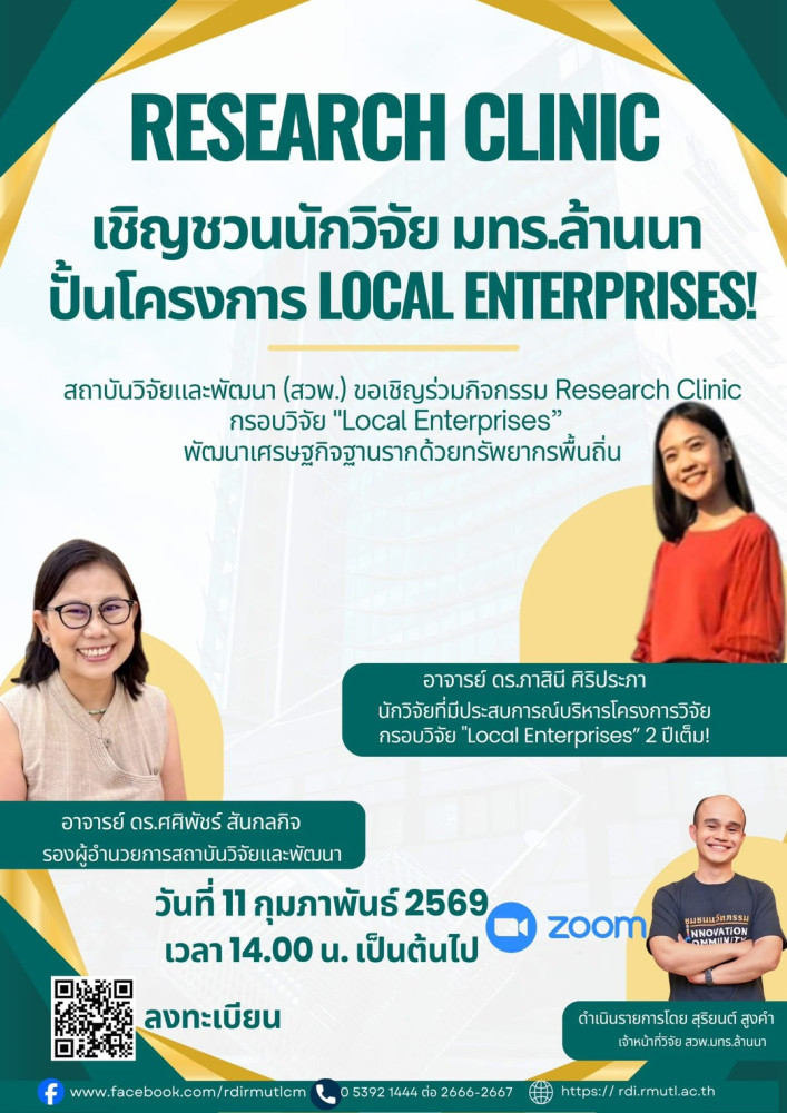 วันที่ 11 กุมภาพันธ์ 2569 สถาบันวิจัยและพัฒนา (สวพ.) จัดกิจกรรม Research Clinic : ปั้นข้อเสนอโครงการวิจัย “Local Enterprises” พัฒนาเศรษฐกิจฐานรากด้วยทรัพยากรพื้นถิ่น ผ่านระบบออนไลน์ เพื...