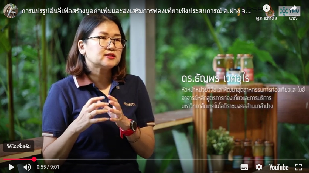 โครงการ "การแปรรูปลิ้นจี่เพื่อสร้างมูลค่าเพิ่มและส่งเสริมการท่องเที่ยวเชิงประสบการณ์" ภายใต้แผนงานการส่งเสริมการนำนวัตกรรมไปใช้ประโยชน์ในพื้นที่เพื่อพัฒนาสังคมและชุมชน (Area based Innovation for Community) ประจำปีงบประมาณ 2567 อุทยานวิทยาศาสตร์ภูมิภาค ภาคเหนือ โดย ดร.ธัญพร เวศอุไร อาจารย์หลักสูตรการท่องเที่ยวและการบริการ มทร.ล้านนา ลำปาง (หัวหน้าหน่วยวิจัยและพัฒนาอุตสาหกรรมการท่องเที่ยวและไมซ์) , อ.วัชรี เทพโยธิน อาจารย์คณะวิทยาศาสตร์และเทคโนโลยีการเกษตร มทร.ล้านนา ลำปาง