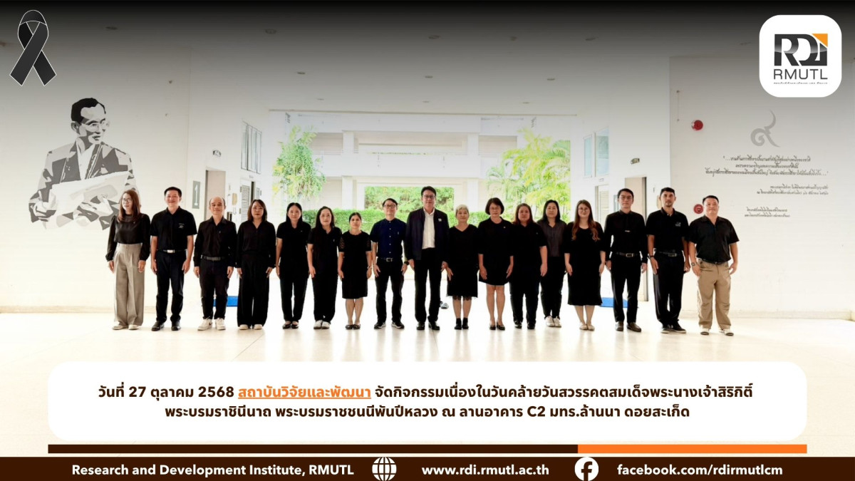 วันที่ 27 ตุลาคม 2568 สถาบันวิจัยและพัฒนา มหาวิทยาลัยเทคโนโลยีราชมงคลล้านนา นำโดย ผศ.ดร.ธีระศักดิ์ สมศักดิ์ ผู้อำนวยการสถาบันวิจัยและพัฒนา ผศ.วิสูตร อาสนวิจิตร รองผู้อำนวยการสถาบันวิจัยและพัฒนา พร้อมด้วยบุคลากร จัดกิจกรรม “กล่าวไว้อาลัยเนื่องในวันคล้ายวันสวรรคต สมเด็จพระนางเจ้าสิริกิติ์ พระบรมราชินีนาถ พระบรมราชชนนีพันปีหลวง” ณ ลานชั้น 1 อาคาร C2 มหาวิทยาลัยเทคโนโลยีราชมงคลล้านนา ดอยสะเก็ด จังหวัดเชียงใหม่