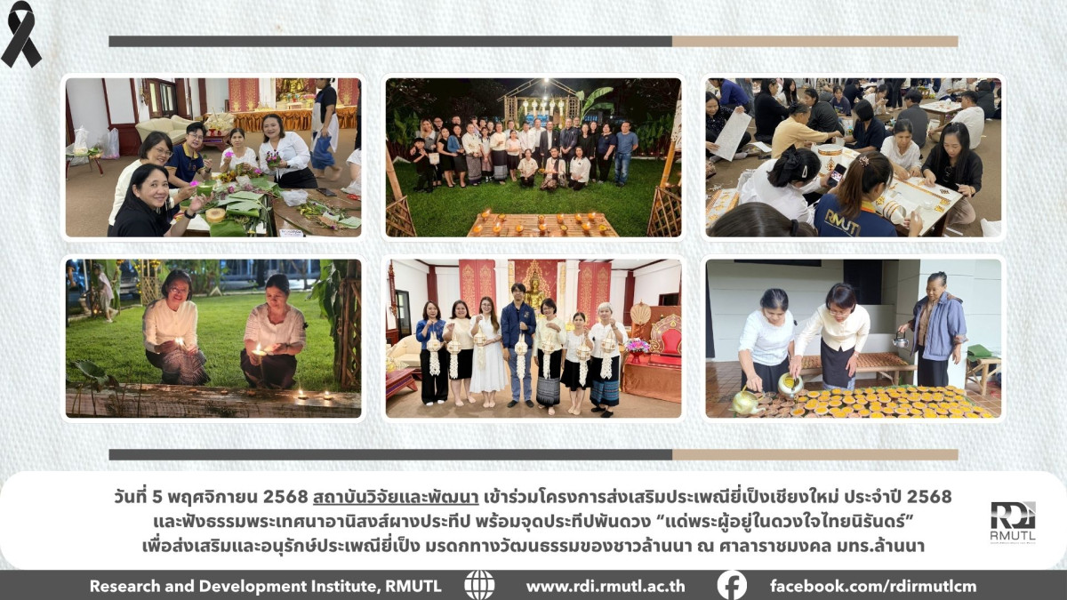 วันที่ 5 พฤศจิกายน 2568 บุคลากรสถาบันวิจัยและพัฒนา มหาวิทยาลัยเทคโนโลยีราชมงคลล้านนา เข้าร่วมกิจกรรมในโครงการ “ส่งเสริมประเพณียี่เป็งเชียงใหม่ ประจำปี พ.ศ. 2568” จัดโดย ศูนย์วัฒนธรรมศึกษา มทร.ล้านนา เพื่อส่งเสริมและอนุรักษ์ประเพณีอันดีงามของท้องถิ่นล้านนา ตลอดจนปลูกฝังจิตสำนึกด้านวัฒนธรรมให้แก่บุคลากรและนักศึกษา
