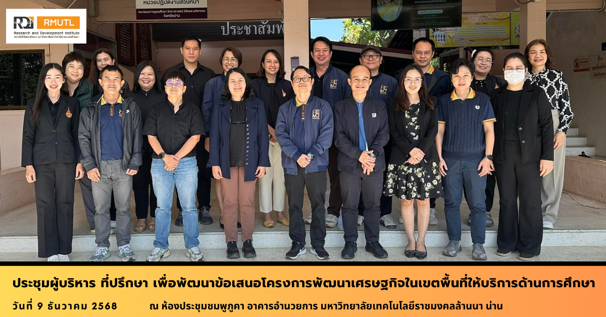วันที่ 9 ธันวาคม 2568 ที่ห้องประชุมชมพูภูคา อาคารอำนวยการ มหาวิทยาลัยเทคโนโลยีราชมงคลล้านนา น่าน ผู้บริหารและบุคลากรจากสถาบันวิจัยและพัฒนา สถาบันถ่ายทอดเทคโนโลยีสู่ชุมชน และแผนงานใต้ร่มพระบารมีได้ร่วมลงพื้นที่เพื่อสนับสนุนและส่งเสริมการดำเนินงานวิจัยและบริการวิชาการของอาจารย์และนักวิจัยในพื้นที่จังหวัดน่าน โดยมีผู้ช่วยศาสตราจารย์ ดร.กันยาพร ไชยวงศ์ รองคณบดีคณะวิศวกรรมศาสตร์ เป็นประธาน