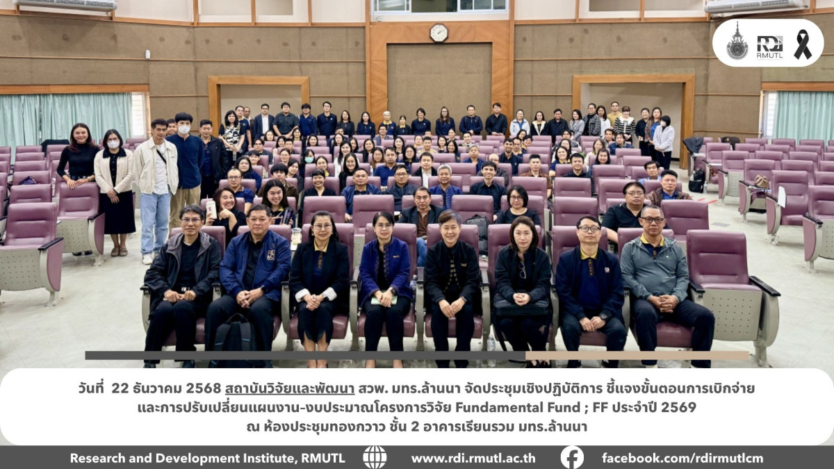 สถาบันวิจัยและพัฒนา มหาวิทยาลัยเทคโนโลยีราชมงคลล้านนา (สวพ. มทร.ล้านนา) จัดกิจกรรมประชุมเชิงปฏิบัติการ เรื่อง การชี้แจงขั้นตอนการเบิกจ่าย และการปรับเปลี่ยนแผนงานและงบประมาณโครงการ ภายใต้แผนงานเสริมสร้างความเข้มแข็งและธรรมาภิบาลในการบริหารจัดการแผนงานและโครงการวิจัยและนวัตกรรม (ววน.) ประจำปี 2569 ระหว่างวันที่ 22 – 23 ธันวาคม 2568 ณ มหาวิทยาลัยเทคโนโลยีราชมงคลล้านนา