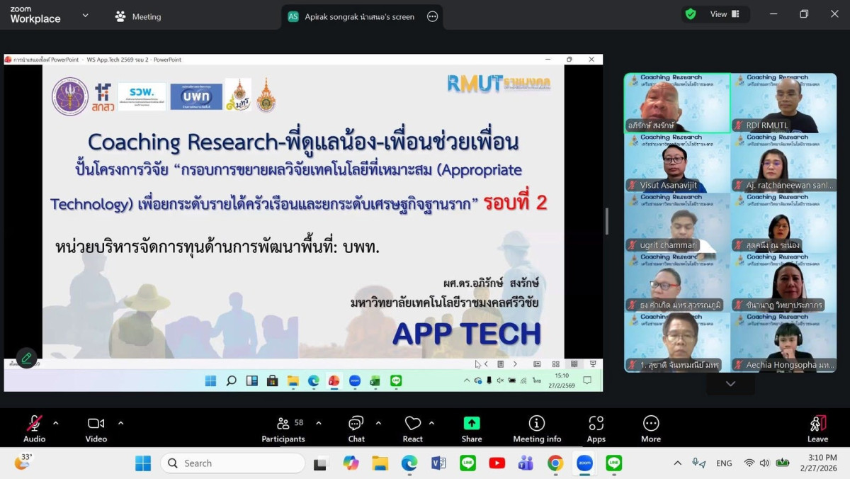 วันศุกร์ที่ 27 กุมภาพันธ์ 2569 เวลา 15.00 น. เป็นต้นไป สถาบันวิจัยและพัฒนา ร่วมกับเครือข่ายมหาวิทยาลัยเทคโนโลยีราชมงคล จัดกิจกรรม Coaching Research ปั้นโครงการ Appropriate Technology ผ่านระบบ Zoom Meeting โดยมีอาจารย์ นักวิจัย และทีมพี่เลี้ยงจากเครือข่ายเข้าร่วมกิจกรรมรวมทั้งสิ้น 71 ท่าน เพื่อร่วมเรียนรู้และพัฒนาศักยภาพในการจัดทำข้อเสนอโครงการวิจัยที่ตอบโจทย์การพัฒนาพื้นที่