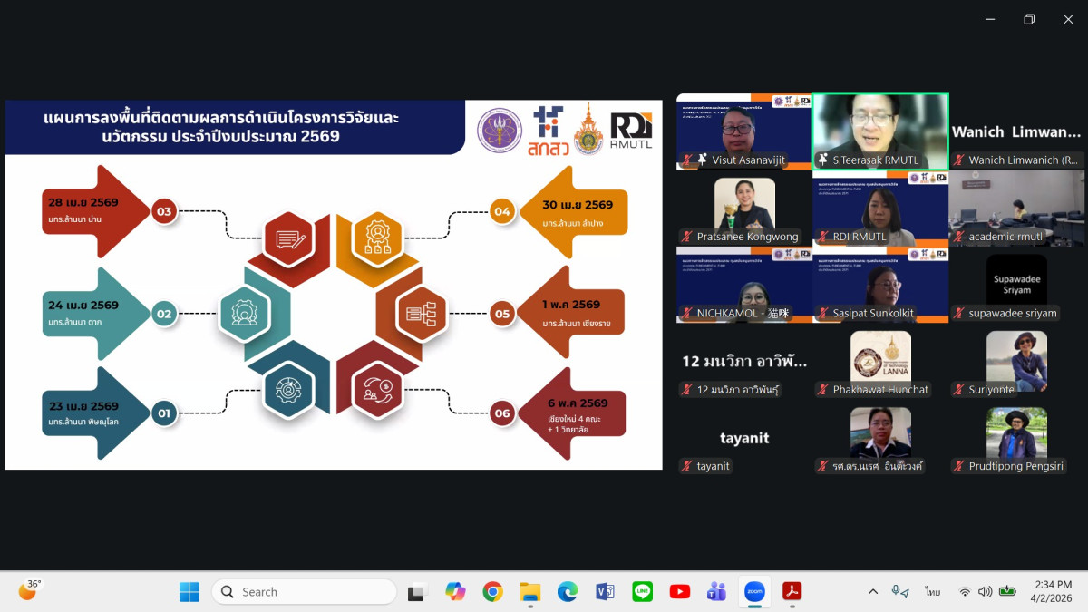 นอกจากนี้ ยังได้แจ้งกำหนดการ ลงพื้นที่เพื่อติดตามผลการดำเนินงานโครงการวิจัย ประจำปีงบประมาณ 2569 เพื่อติดตามความก้าวหน้า รับฟังปัญหาอุปสรรค และให้คำแนะนำแก่นักวิจัยในพื้นที่ เพื่อให้การดำเนินงานเป็นไปตามแผนงานและบรรลุวัตถุประสงค์อย่างมีประสิทธิภาพ