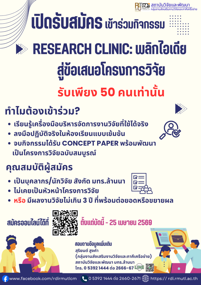 #RDIRMUTL #ResearchClinic #มทรล้านนา #นักวิจัยรุ่นใหม่ #ขอทุนวิจัย