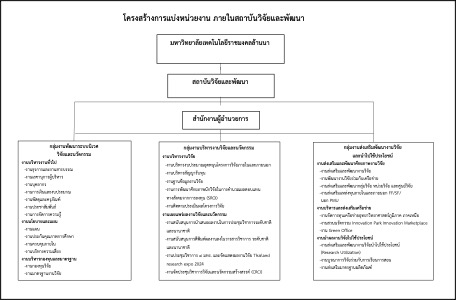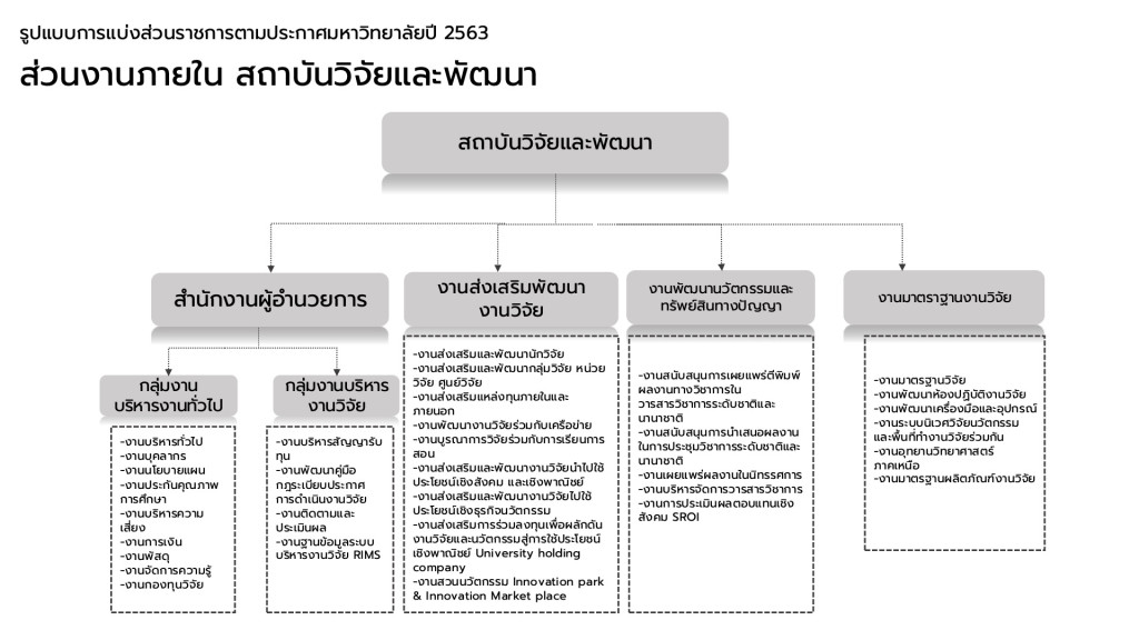 ต่อมามหาวิทยาลัยได้เสนอต่อสภามหาวิทยาลัยเทคโนโลยีราชมงคลล้านนาให้แบ่งส่วนราชการและส่วนงานภายในมหาวิทยาลัยในการประชุมครั้งที่ 24 (15/2562) เมื่อวันที่ 16 ธันวาคม พ.ศ. 2562 จึงได้ออกประกาศมหาวิทยาลัยเทคโนโลยีราชมงคลล้านนา เรื่อง การแบ่งส่วนราชการและส่วนงานภายในมหาวิทยาลัยเทคโนโลยีราชมงคลล้านนา พ.ศ. 2563 ซึ่งประกาศ ณ วันที่ 11 กุมภาพันธ์ พ.ศ. 2563 โดยให้มีการแบ่งส่วนราชการในสถาบันวิจัยและพัฒนา ดังนี้ สำนักงานผู้อำนวยการ ประกอบด้วย กลุ่มงานบริหารงานทั่วไป และกลุ่มงานบริหารงานวิจัย งานส่งเสริมพัฒนางานวิจัย งานพัฒนานวัตกรรมและทรัพย์สินทางปัญญา และงานมาตรฐานงานวิจัย และปัจจุบันสถาบันวิจัยและพัฒนา ผู้อำนวยการได้ปรับปรุงโครงสร้างให้สอดคล้องกับบทบาทหน้าที่ที่ได้รับมอบหมาย และมอบหมายให้บุคลากร แบ่งเป็น 3 กลุ่มงาน คือ กลุ่มงานพัฒนาระบบนิเวศวิจัยและนวัตกรรม กลุ่มงานบริหารงานวิจัยและนวัตกรรม และกลุ่มงานส่งเสริมพัฒนางานวิจัยและนำไปใช้ประโยชน์